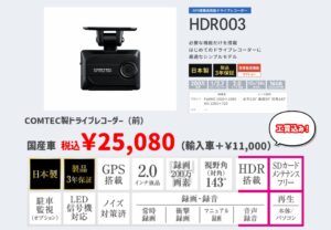 弊社で取り扱う1カメラモデルのドライブレコーダーがCOMTEC製の『HDR003』になりました!